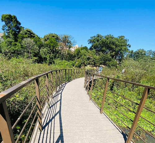 Com percurso leve e bem sinalizado, os caminhos contornam áreas arborizadas e o lago central, proporcionando sombra, ar puro e contato com uma vegetação diversificada.
