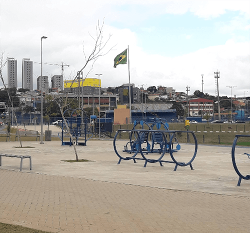 A academia ao ar livre do Parque da Cidade de Itapevi é equipada com aparelhos de ginástica voltados para alongamento, fortalecimento muscular e exercícios aeróbicos.