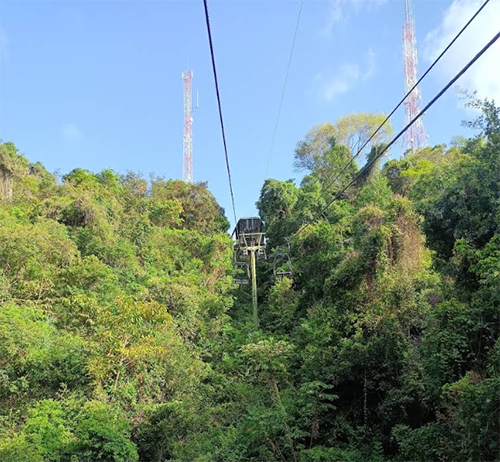 O acesso pode ser feito por trilhas ou pelo teleférico, proporcionando diferentes experiências aos visitantes.